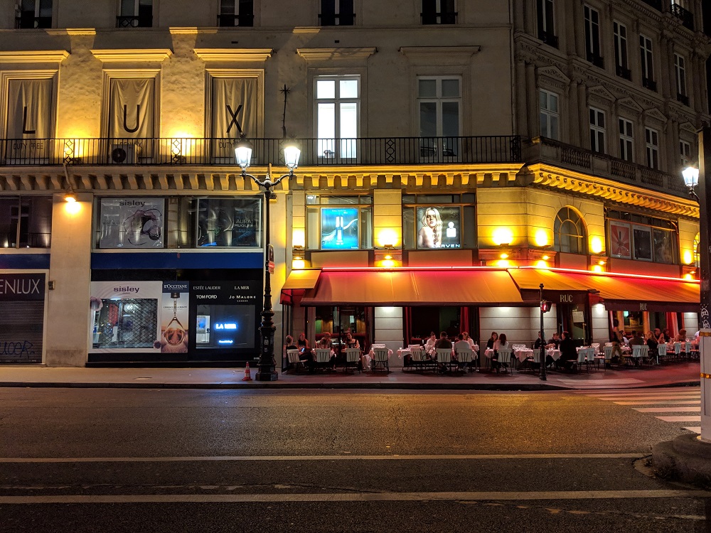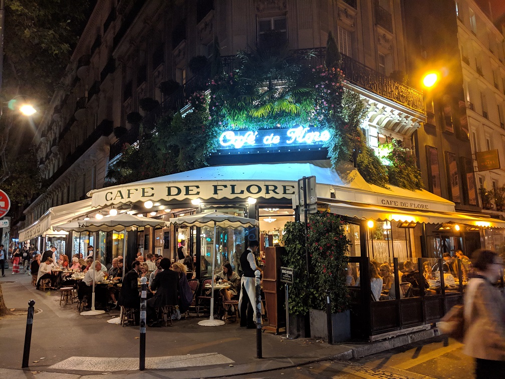 8:50 pm ツアーの集合時間までは1時間しかないので、簡単に夕飯を済ませます。隣のカフェ・ドゥ・フロール(Café de Flore) へ。ピカソやダリなどの著名人も通ったという歴史ある老舗のカフェです。