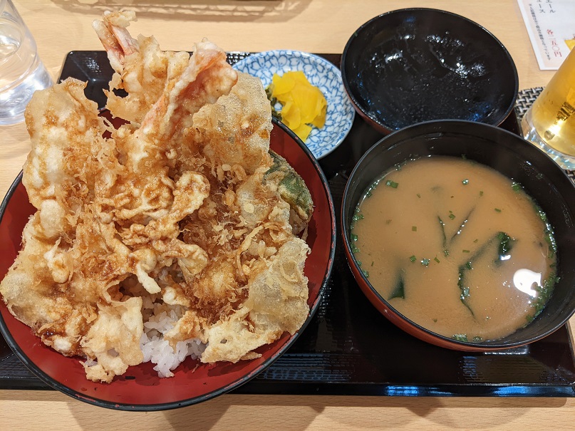 通常サイズを注文したが、この大きさ。エビが羽を広げたチョウのようになっている。衣がサクサクで生ビールにも合う。