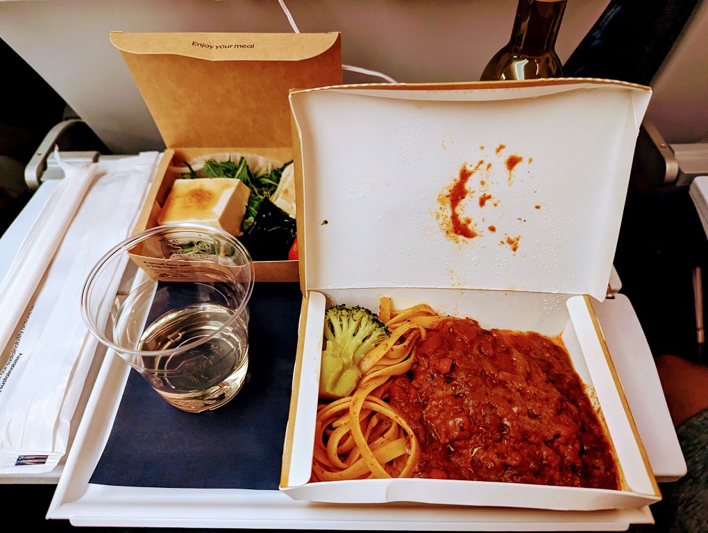 夜便なので、少しは空いているかと思ったら、エコノミークラスは満席にみえました。搭乗して、しばらくすると1回目の食事です。以前は違いましたが、機内の食事は1種類のみで選択はなし、容器は紙のボックスになっていました。