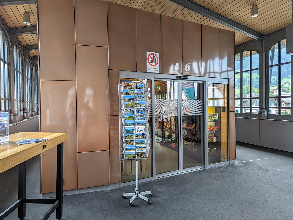 リギ・クルム駅の様子。右上に小さく写っているオープンテラスまで行くつもりでしたが・・ちょうど帰りの電車が停車していおり、次の電車は2時間後?ということで、このままこの電車に乗ることにしました。行きは青い電車、帰りは赤い電車と思っていのたですが、あれ?新しい電車でしょうか。