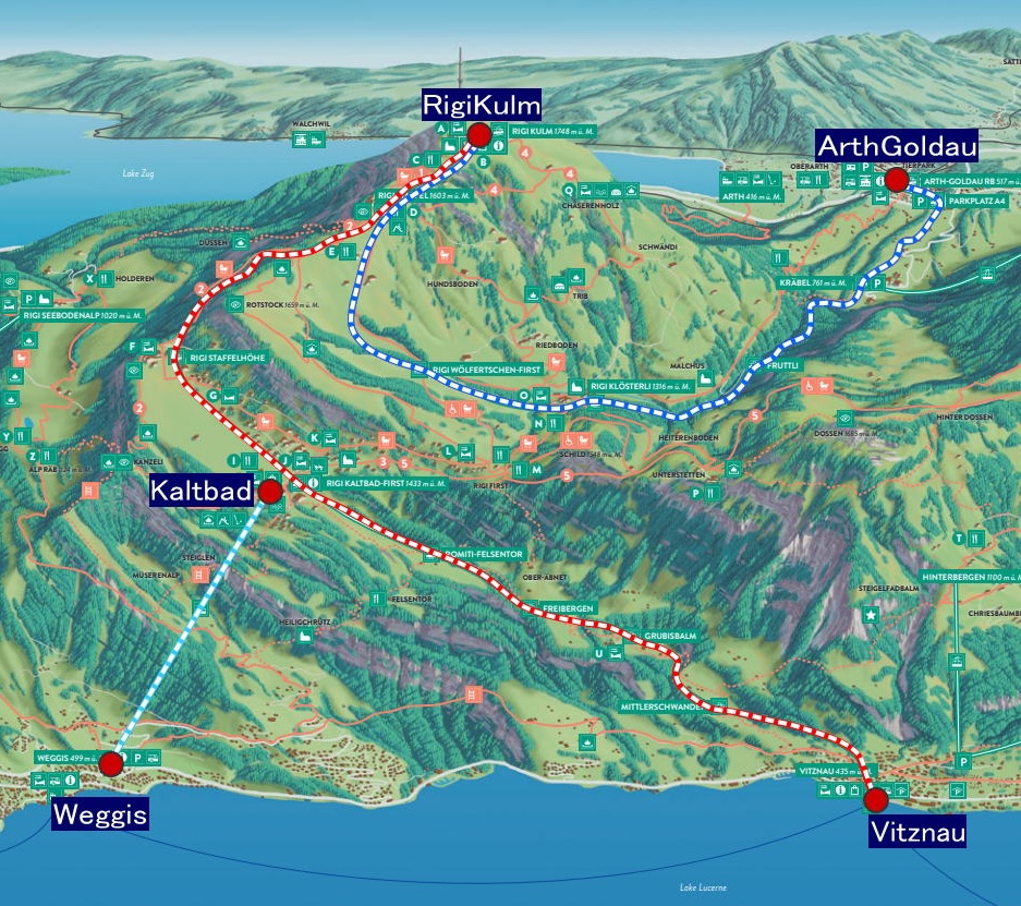 ここから、チューリッヒ中央駅まで行き、乗り換えをしてアルト ゴルダウ駅(Arth-Goldau)まで行きます。雨が降っていないようなので、「山の女王」と呼ばれるリギ山(標高約1,797m)まで行ってみることにします。