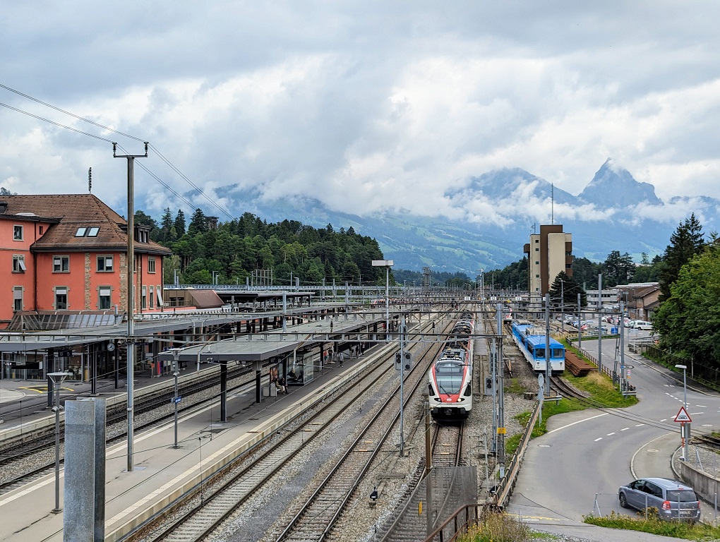 アルト ゴルダウ駅に到着。写真は進行方向に対して後ろ側を見て撮ったところ。見づらいですが、奥の方に「ARTH-RIGI-BAHN」と書いてある建物があり、その左手に青い車両が見えますか。その登山電車に乗ります。