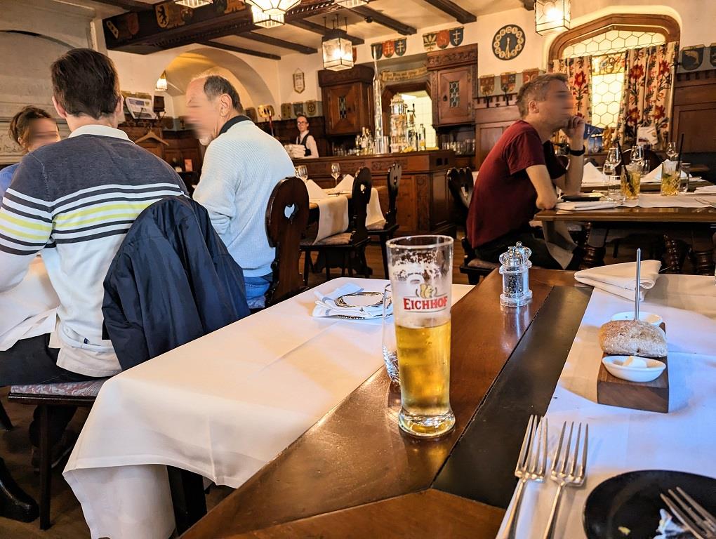 少し休んでから、予約したレストラン、ブルガーシュトゥーベ(Burgerstube)に向かいます。ここはルツェルンで最も古いと言われている老舗のスイス料理レストランだそうです。ヴィルデン・マン・ホテル(Hotel Wilden Mann)内にあります。