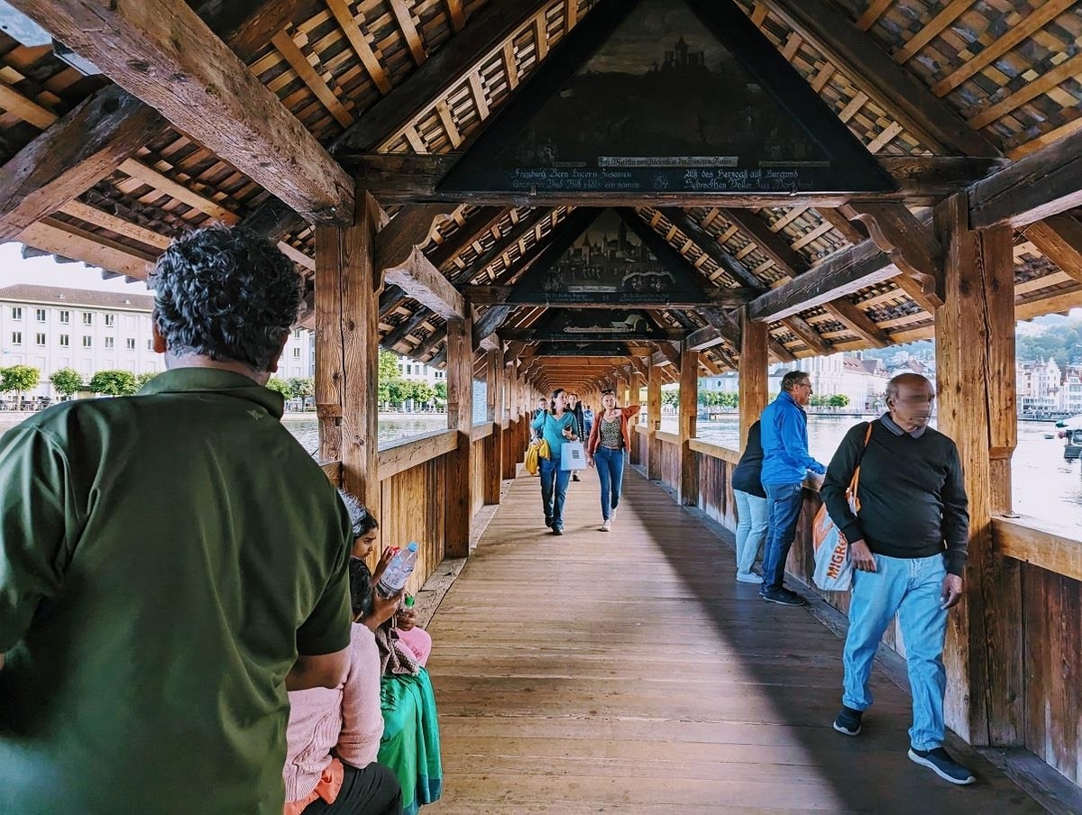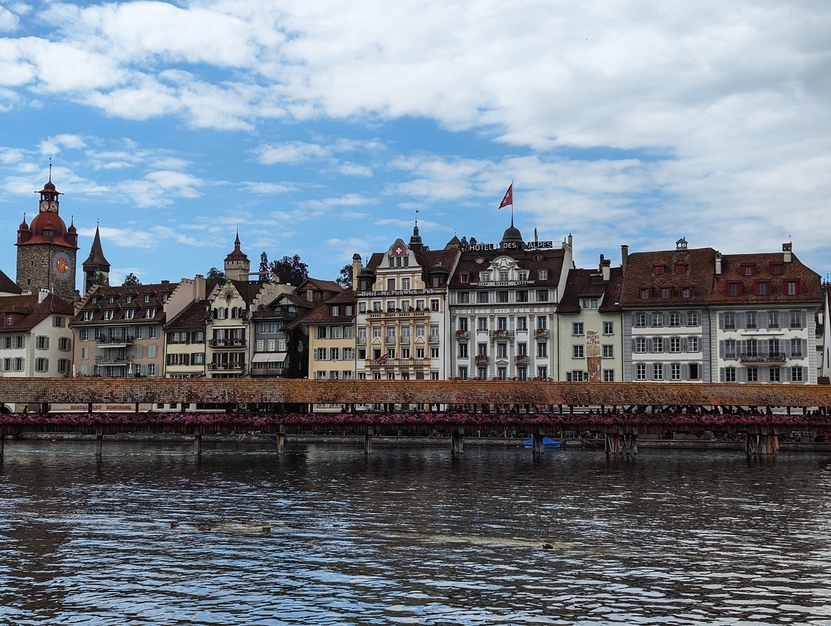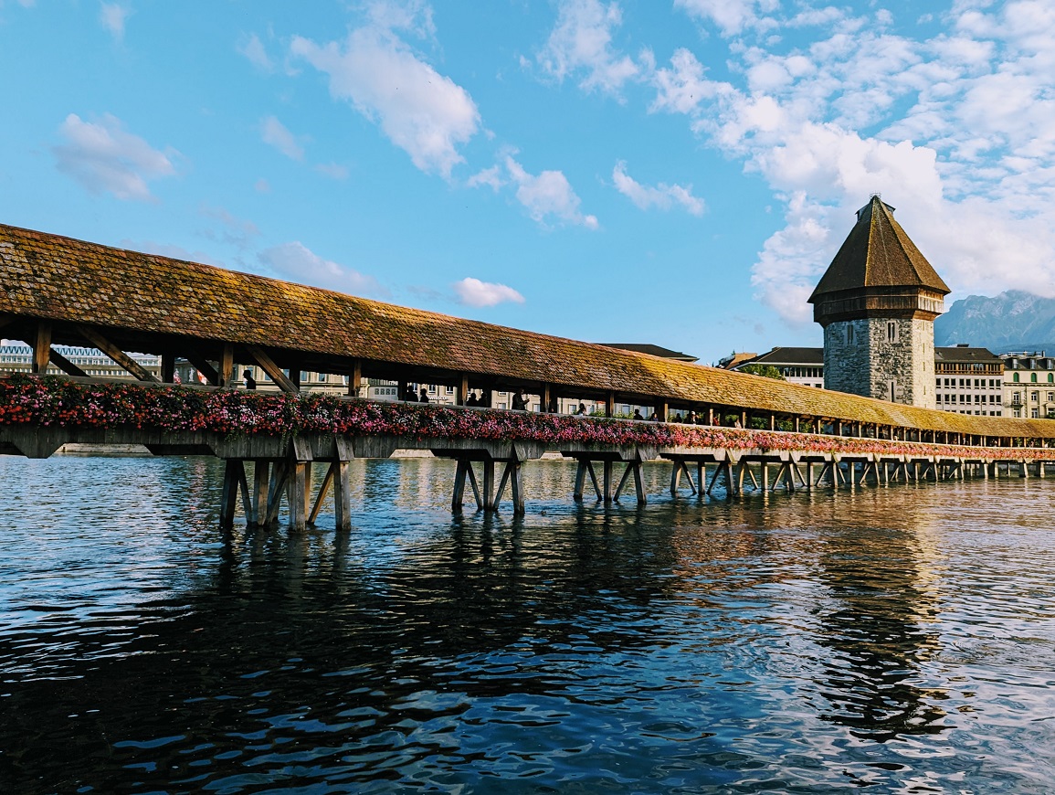 ルツェルンという街を調べると最初に出てくるのが、この写真のカペル橋です。屋根付き、木造の橋です。ロイス川に架かる橋で、長さは約200mもあるのだそうです。