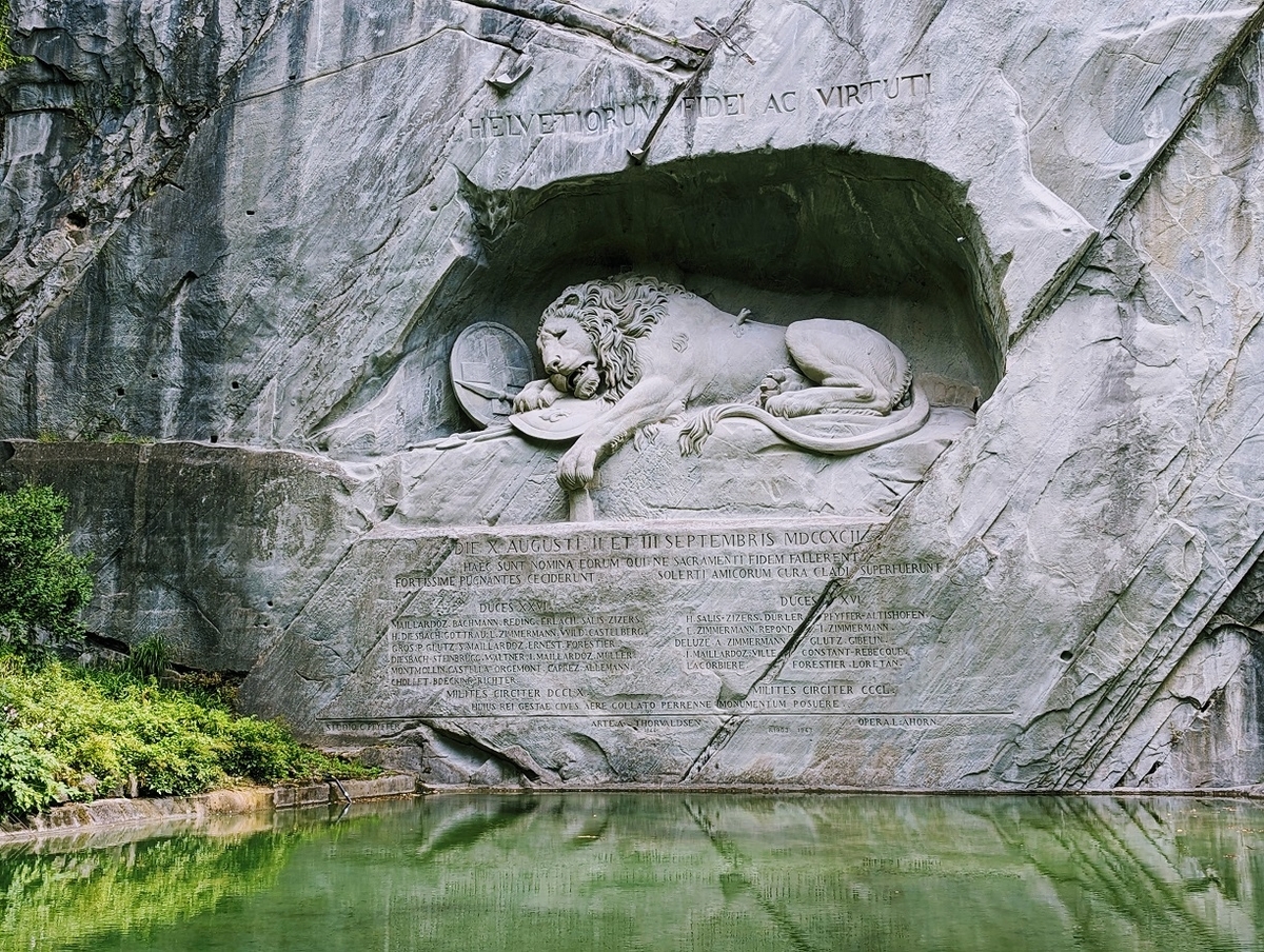 1792年8月10日、フランス革命でスイス兵部隊がチュイルリー宮殿でルイ16世一家を守って亡くなった700人以上のスイス兵の果敢な英雄的行為を称えて、1821年に断崖にこの慰霊碑を刻んだそうです。確かに悲しそうな顔が印象的です。