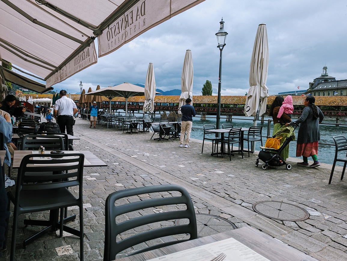 シュプロイヤー橋が見えます。ここはカペル橋から400m程上流に位置します。このまま進み、川沿いのレストランでランチすることにします。
