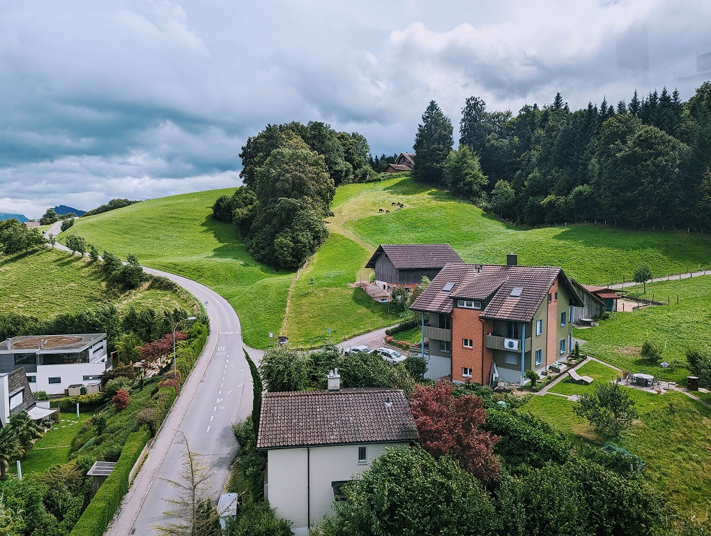 どんどん小さくなる街、眼下に広がる牧歌的な景色を楽しんでいました。ところが標高が高くなるにつれて、「ゴォー」というすごい音がして風が強くなってきました。見下ろすと、木々が倒れんばかりに傾いているではないですか。ゴンドラも左右に揺れます。