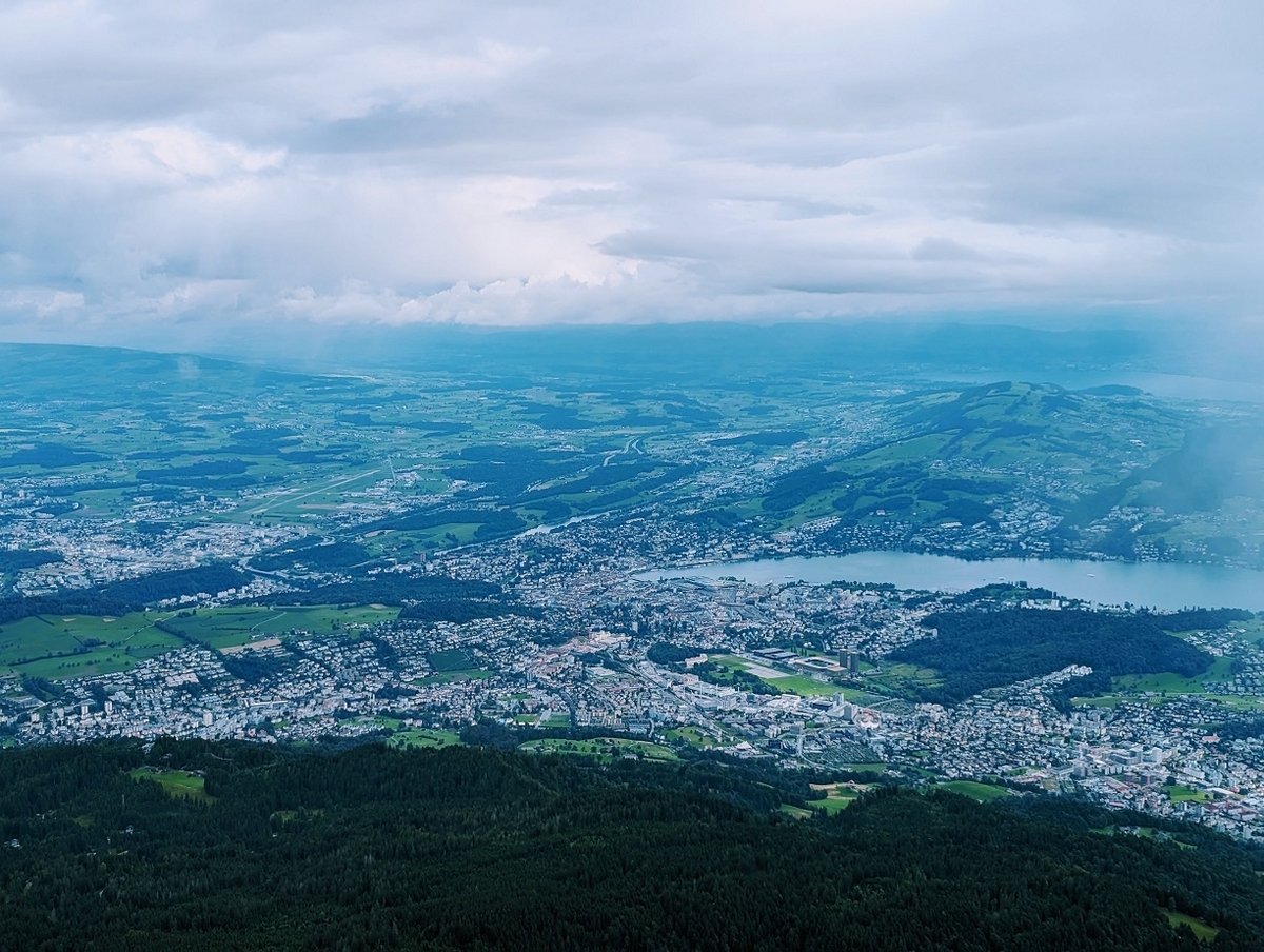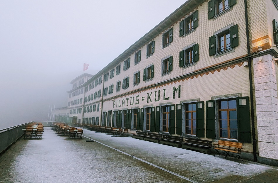 スイスに行ったらどこか山岳ホテルに泊まりたいと思っていました。そこで、ピラトゥス山(標高2,132m)の歴史あるホテル、ピラトゥス クルム(Hotel Pilatus-Kulm)に予約を入れました。上の左手に写っている白いホテルです。