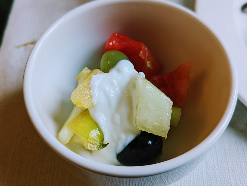 トマトとマンゴーのカプチーノ。このスープを飲んだら、お腹がいっぱいになってしまいました。