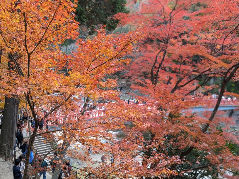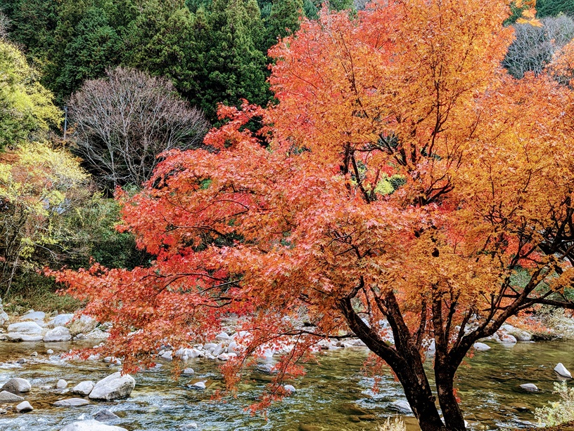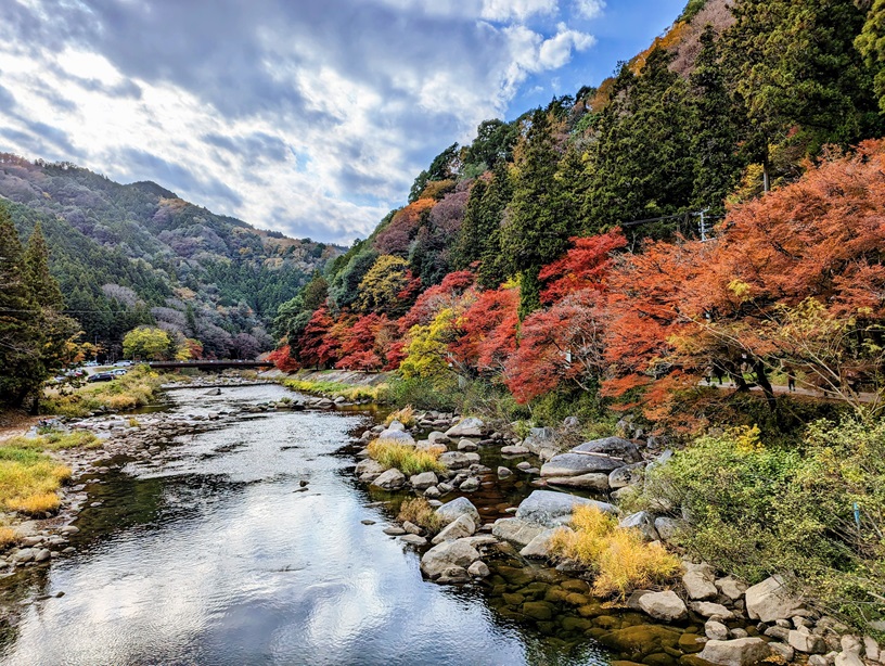 バスは1人2席で、1時間半ほど乗っていたと思います。バスを降り、後ろを振り返ると、そこには息をのむような美しい、色鮮やかな景色が目に飛び込んできました。香嵐渓の入口にもなっている橋まで全員で行き、そこからは約150分の自由時間となります。