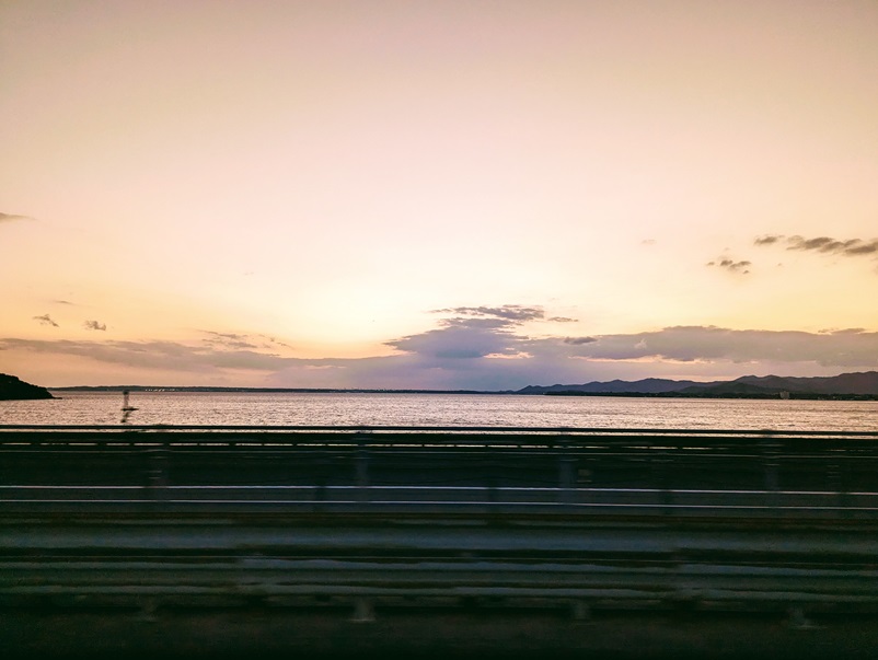 16時半くらい。最終の列車は行ったあとでした。夕日が湖面に映り、なんて美しいのでしょう。写真ではわかりづらいですが、湖面の色は深い緑で、スイスで見た湖を思い出しました。