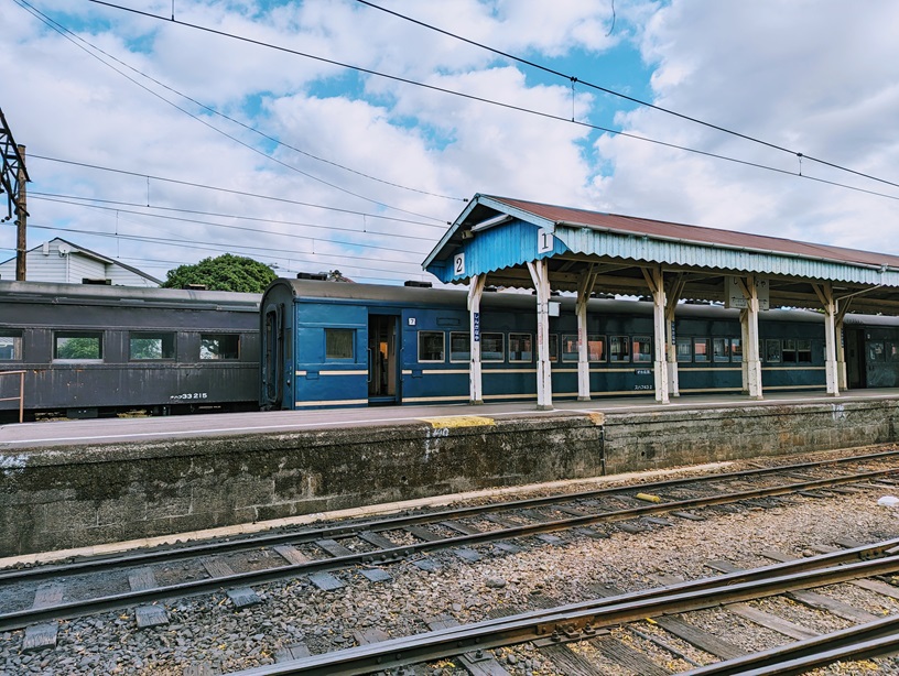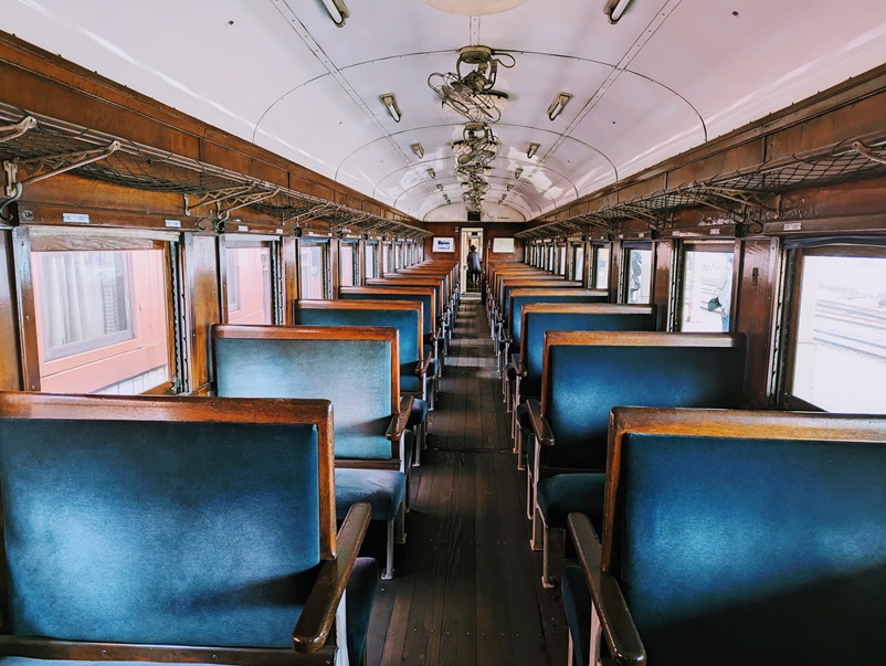 車内は4人向い合せのボックス座席、レトロ感があり、清潔でどこか気品のようなものを感じます。天井には扇風機と蛍光灯、網棚の網は本物で、タイプスリップしたかのようでした。
