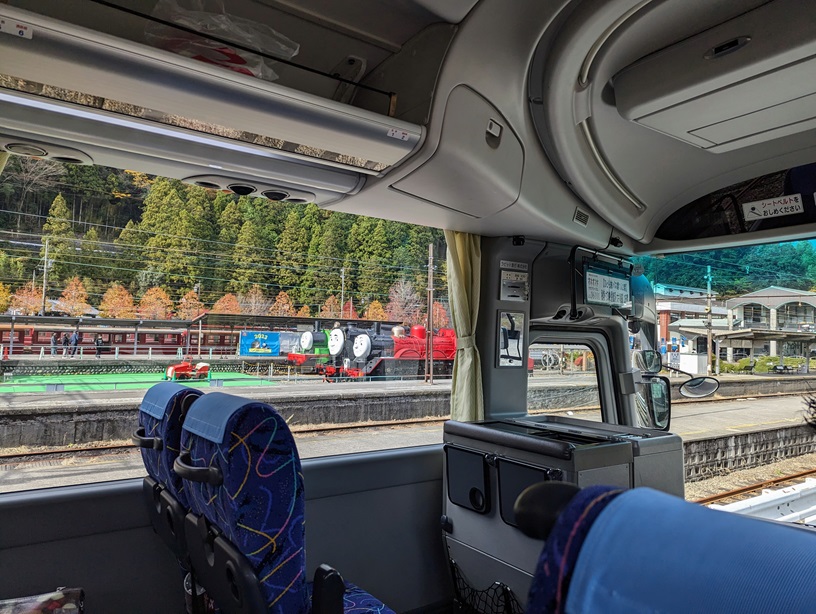 さて、バスで大井川鐡道の新金谷駅まで向かいます。今日は、大型バスでは行けないところもあるということで、1人1席の小型バスです。