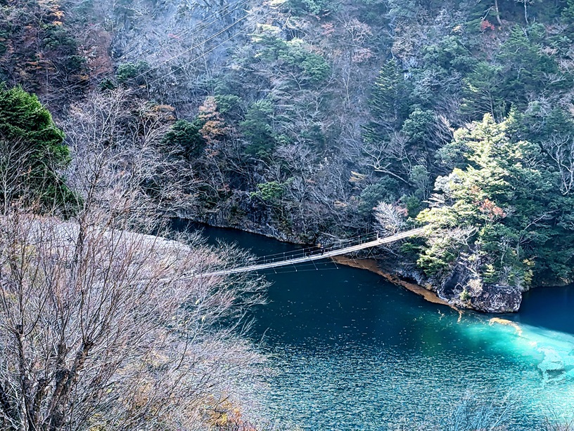 寸又峡の夢のつり橋です。橋を渡るのに30分待ちだそうです。今回のツアーでは時間制限のため、上から見るだけでしたが、十分美しかったです。