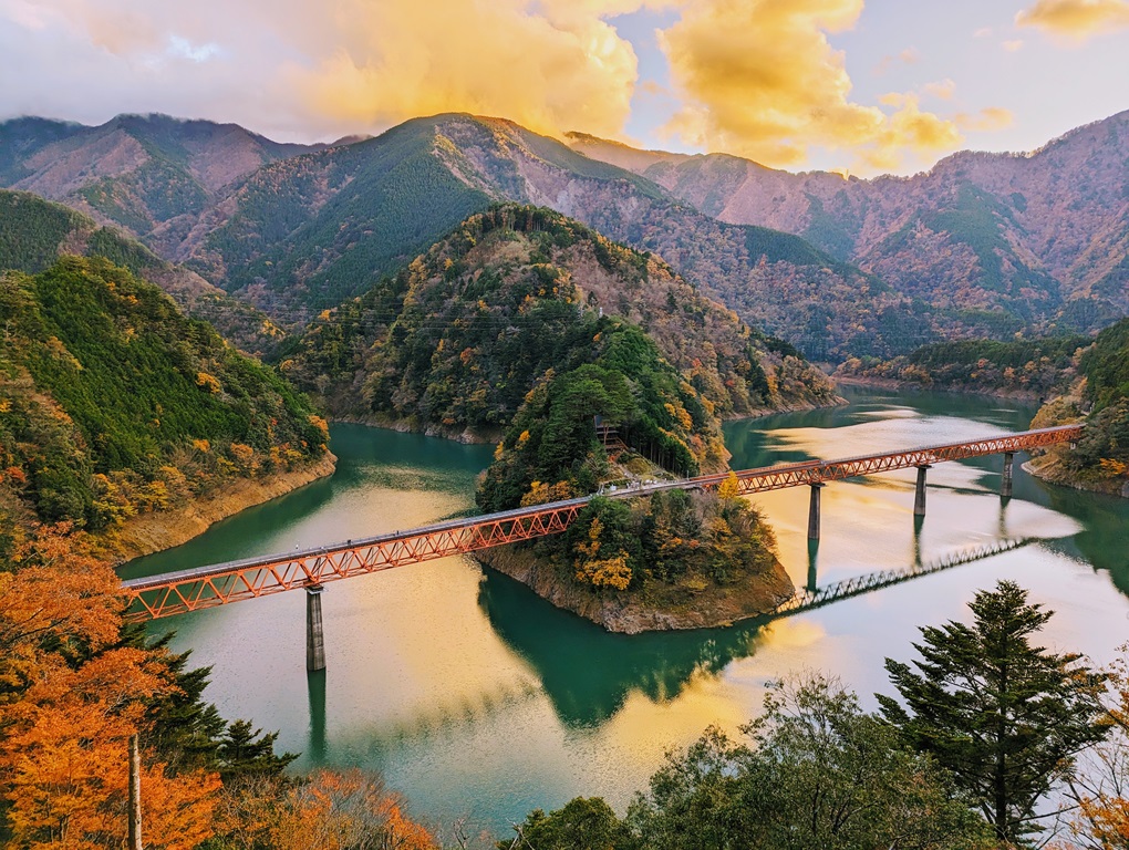 湖のグリーンと赤い橋、そして紅葉のコントラストが印象深いです。