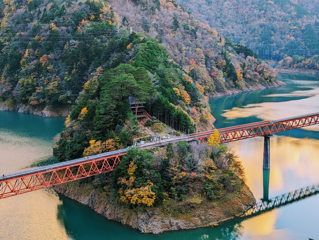 再びバスに乗り込み、最後の見どころである奥大井湖上駅が見下ろせる展望スポットに行きます。湖の上にある秘境の駅です。