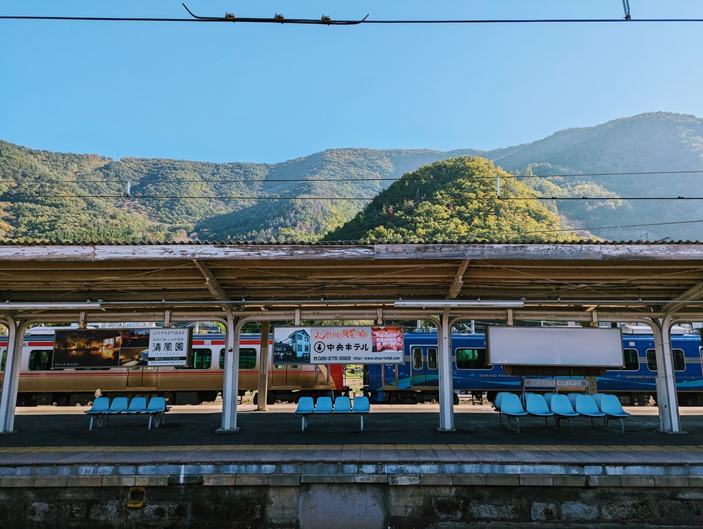駅の向こう側に見える山がステキ。ググってみると、この駅から、佐良志奈神社まで行き、山を登っている人のブログを見つけました。今回は泊まるだけでしたが、すぐそばには千曲川も流れているので、ゆっくり散歩するのも良さそう。