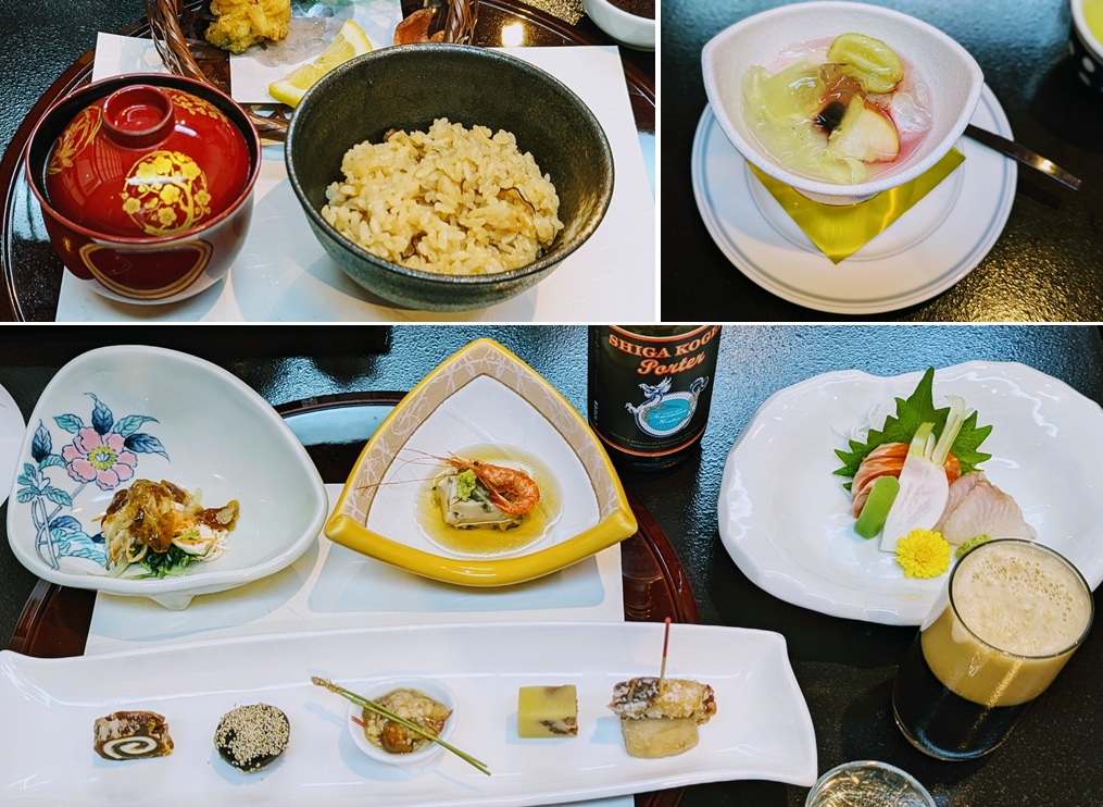先に温泉にはいり、浴衣でいただく夕ご飯はとても美味しかったです。下の写真以外にもメインのステーキと焼き魚がついています。今日は運動もしたので、ビールが最高に美味しい・・。
